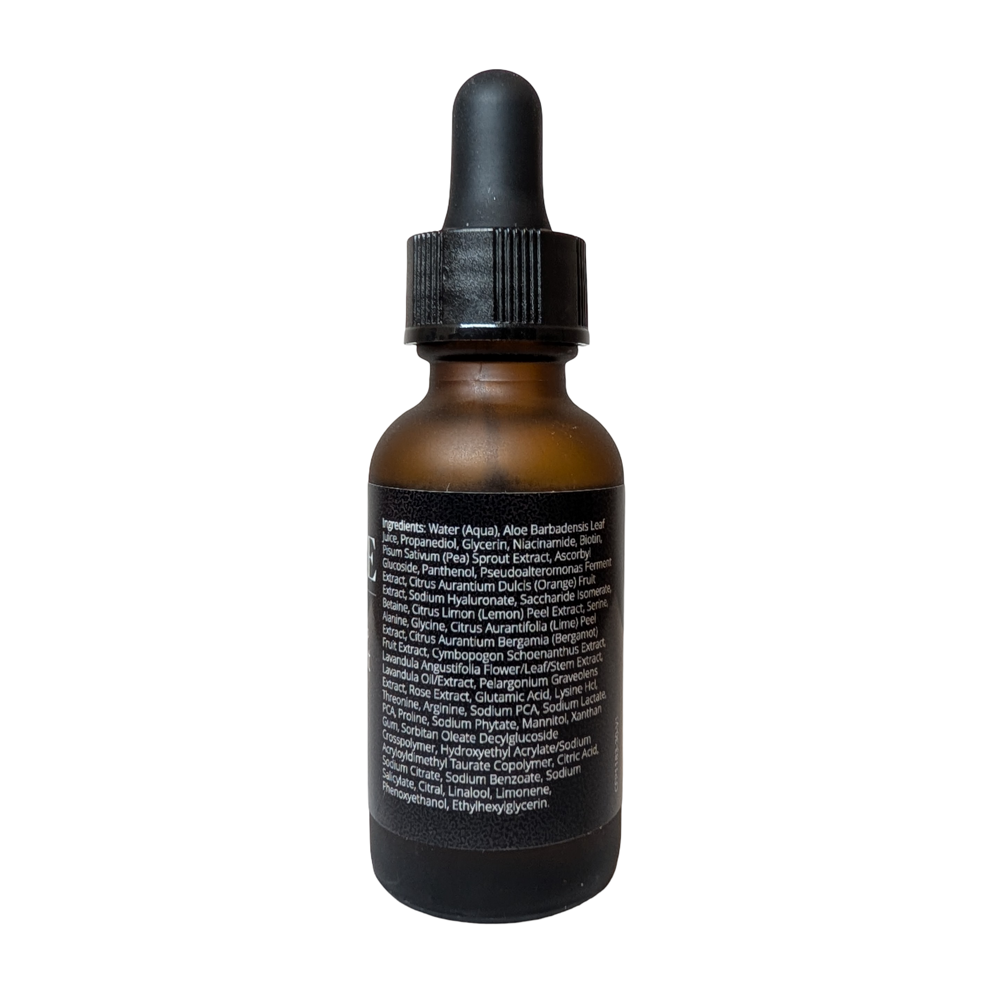 Water (Aqua), Aloe Barbadensis Leaf Juice, Propanediol, Glycerin, Niacinamide, Biotin, Pisum Sativum (Pea) Sprout Extract, Ascorbyl Glucoside, Panthenol, Pseudoalteromonas Ferment Extract, Citrus Aurantium Dulcis (Orange) Fruit Extract, Sodium Hyaluronate, Saccharide Isomerate, Betaine, Citrus Limon (Lemon) Peel Extract, Serine, Alanine, Glycine, Citrus Aurantifolia (Lime) Peel Extract, Citrus Aurantium Bergamia (Bergamot) Fruit Extract, Cymbopogon Schoenanthus Extract, Lavandula Angustifolia Flower/Leaf/Stem Extract, Lavandula Oil/Extract, Pelargonium Graveolens Extract, Rose Extract, Glutamic Acid, Lysine Hcl, Threonine, Arginine, Sodium PCA, Sodium Lactate, PCA, Proline, Sodium Phytate, Mannitol, Xanthan Gum, Sorbitan Oleate Decylglucoside Crosspolymer, Hydroxyethyl Acrylate/Sodium Acryloyldimethyl Taurate Copolymer, Citric Acid, Sodium Citrate, Sodium Benzoate, Sodium Salicylate, Citral, Linalool, Limonene, Phenoxyethanol, Ethylhexylglycerin.